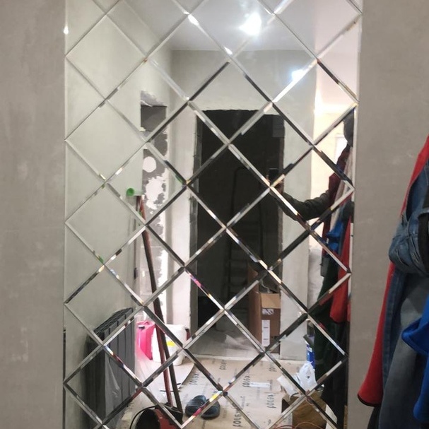 Использована квадратная серебристая зеркальная плитка размером 18х18.